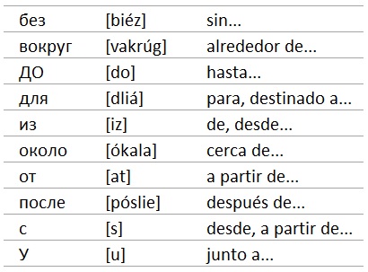 Como se puede observar, el complemento del nombre que en español está introducido por la preposición de, en ruso no lleva preposición y se indica por un cambio del sustantivo. Estos sustantivos, en nominativo, son los siguientes: