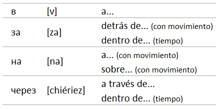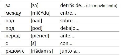 - за [za]: detrás de (sin movimiento). Сидеть за столом [sidiét za stalóm]: estar sentado en la mesa;